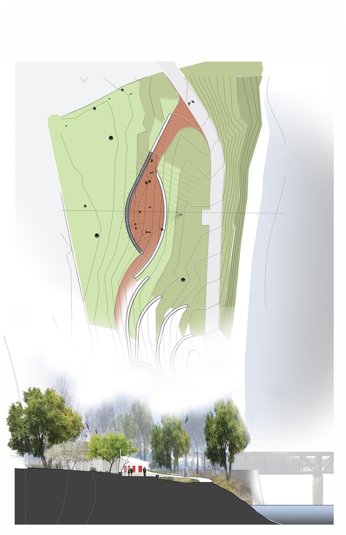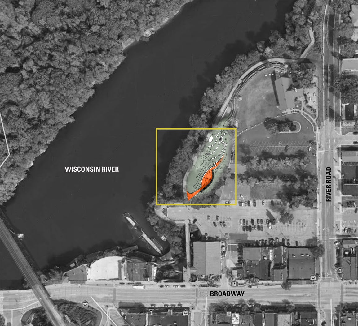 Wisconsin Dells has been a tourist destination for 150 years; its miniature golf, dinner cruises, and water parks bring summer vacationers to the area religiously every summer. But the beauty of the Wisconsin River weaving through dramatic rock formations is what originally put the Dells on the map. Joseph Leute grew up in the area and has been photographing the River ever since his professor at the University of Wisconsin-Madison encouraged him to pursue the subject. Leute's passion for telling the story of the River led him to obtain a grant to install a permanent outdoor exhibit on the riverbank, which would display a series of his photographs. Level was invited to investigate and develop a design for the exhibition, titled “Soul of the River.” Our design centered around the creation of an outdoor room carved into the natural rolling landscape at the river’s edge. The structure is functionally programmed as a linear easel, creating a surface suitable for mounting large-scale photographs depicting the river’s history. The uniquely shaped landscape of the river's edge is among the most interesting in the Midwest, and has been captured in photographs extensively by H.H. Bennett, who introduced the world to this remarkable terrain in the years between 1865 and 1908.
