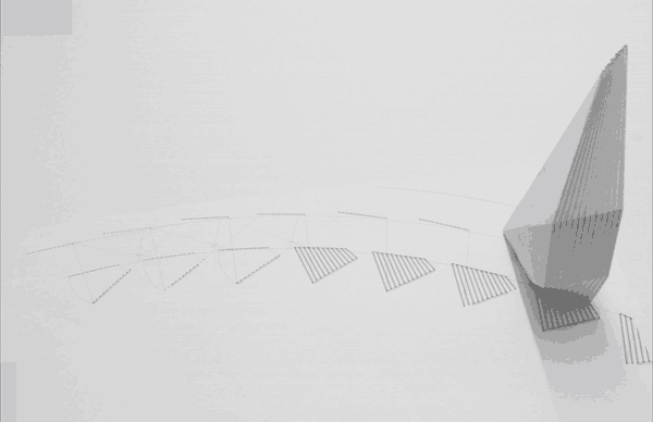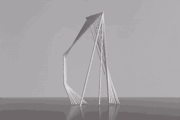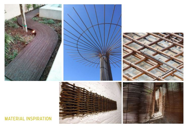 When left to rust, rebar possesses the tactile quality and the color of a warm terra cotta. This materiality references the local transportation infrastructure. It can also be assembled to resemble a veil, which creates both a sense of translucency and a backdrop for the exhibit.