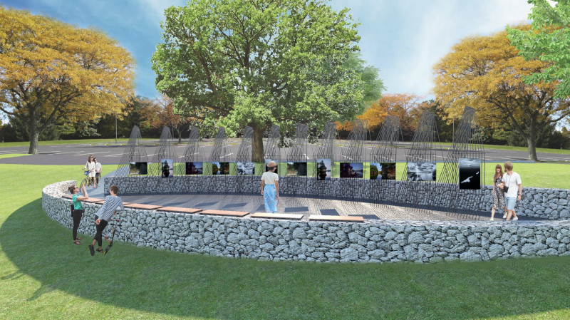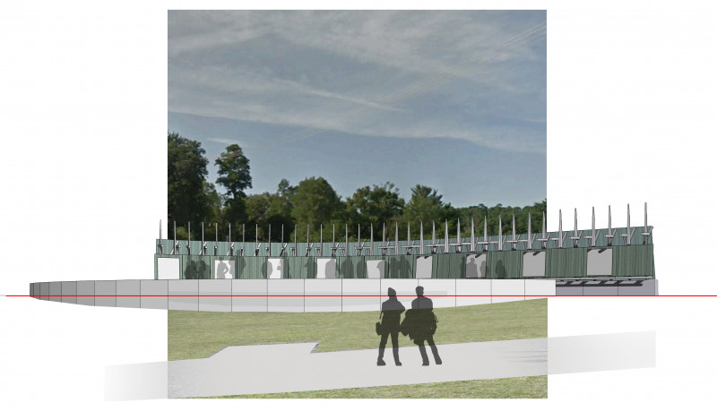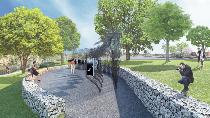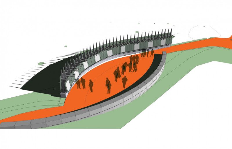 A pathway leads to the exhibit, with the rebar structures slightly canted to face the artwork towards the oncoming visitor.